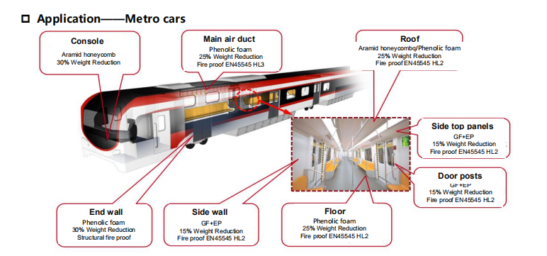 Advantages: Compared with the traditional aluminum honeycomb roof panel, the areal density of fiber reinforced phenolic foam roof panel <4.8kg/㎡, loading practice shows that the actual weight loss reaches 27.1%; thermal insulation effect is more obvious, with thermal conductivity 0.079W/(m.K), there’s no need to use the thermal insulation cotton; sound insulation amount reaches 24dB (8mm thickness); to meet the requirements of the European Union banned substances to meet the EN45545-2 HL2 level material fire protection.